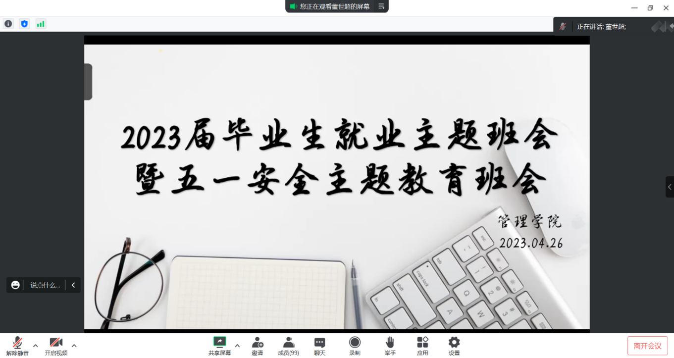4月26日,风车动漫 顺利举行2023届本科毕业生就业暨五一安全教育主题班会,会议由2019级辅导员董世超主持,2019级全体同学参与此次会议。