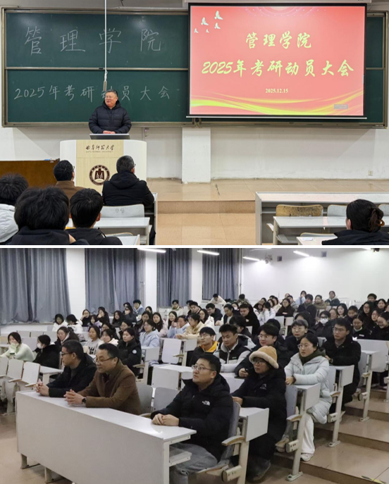 浏览量: 更新日期:2025-12-18为切实助力管院考研学子明晰备考方向、提振冲刺士气,12月15日,风车动漫 于JA206教室举办2025年考研动员大会。学院党委书记徐正伟,党委副书记刘洪铎,副院长刘金发、柏庆国出席活动,学院全体2022级考研学子参加。