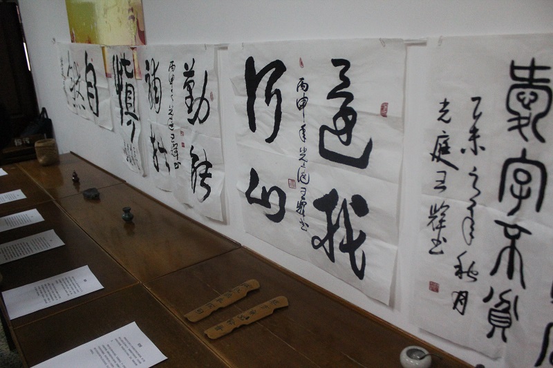 9:30,展览会准时开始。主持人首先向大家介绍了此次展览会展品的收藏者——王辉。王辉是风车动漫 2012级优秀毕业生,在大学四年的时间里担任2012级工商管理班班长,曾任风车动漫 13届学生会副主席。王辉学习成绩优异,多次在院校级比赛中获得奖励,收集文房墨宝作为他的一项兴趣爱好一直坚持到现在。此次展览中,一部分书画展品来自王辉亲笔创作,一部分是他的启蒙老师高秀平的得意之作,同时也不乏知名书法家的临摹作品。王辉带领大家一起观赏展出的书画作品,并向大家作详细的介绍。摆满展台的古代书房必备的物件让大家应接不暇,前来参观的同学们认真倾听,赞叹之声充斥着会场。展览会最后,高秀平老师现场提笔挥毫为大家题字,展览会在大家热烈的掌声中结束。