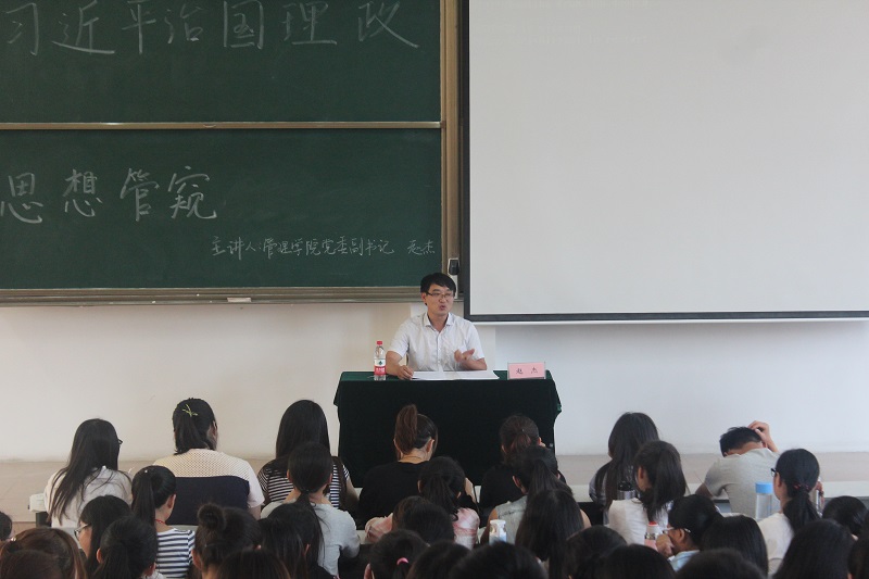 会议伊始,赵杰书记首先结合中外时事政治,生动地阐述了当前国际环境状况、我党面临的挑战以及社会发展过程中的相关问题,使同学们对于当前我国发展的大环境有了一个清醒的认识。随后,赵书记带领大家一起学习了习近平谈治国理政思想的内容体系并对同学们做出了具体要求,他鼓励大家要珍惜机会,认真学习,提升自己思想政治觉悟,在生活、工作、学习中起先锋模范作用。最后,培训会在同学们热烈的掌声中落下帷幕。
