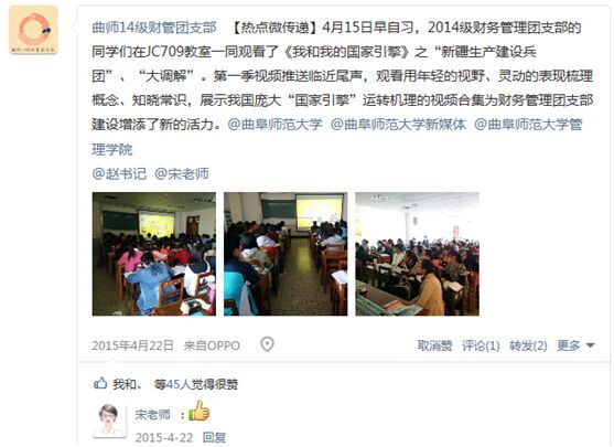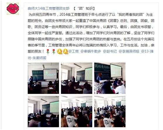 主题班会由各班团支书带领共青团员了解中国共青团的知识,共唱国歌及共青团团歌,宣读入团志愿书,面向团旗庄严的宣誓,重温入团誓词。以手写心,展示我青年的梦想,传递积极向上的青年力量。线上活动以“青年足迹,青年力量”为主题,在风车动漫 新媒体上展开了积极的互动,同学们通过上传照片及美文来参与互动,反响热烈。各社团成员积极参与,以实际行动庆祝自己的节日——五四青年节。这也使他们提高自己的荣誉感、责任感和使命感,时刻不忘自己是共青团的一员,时刻牢记自己的历史责任。