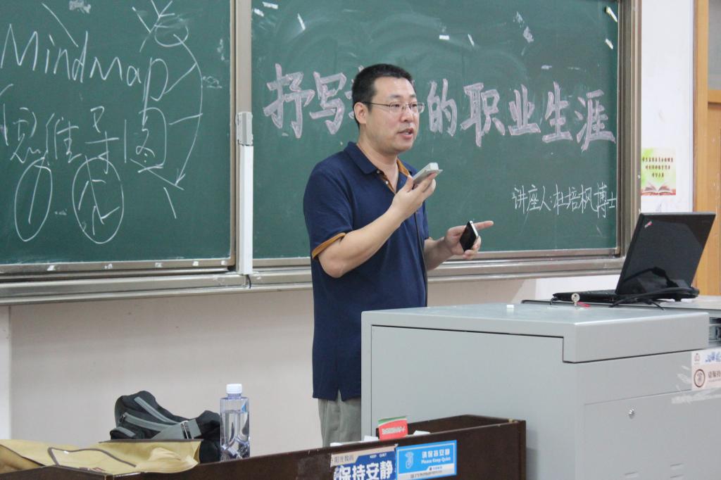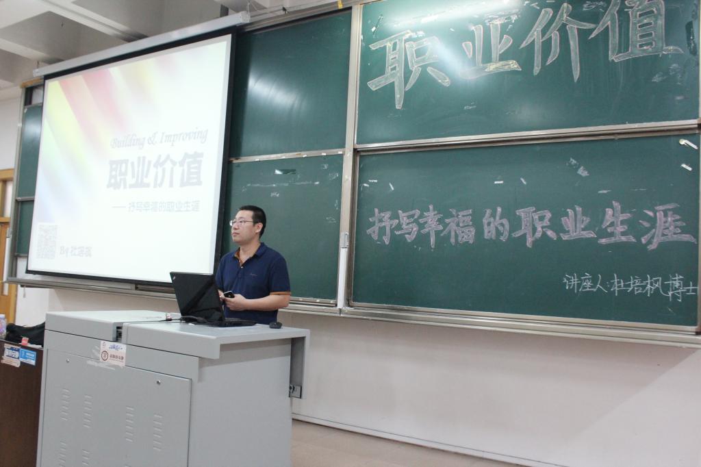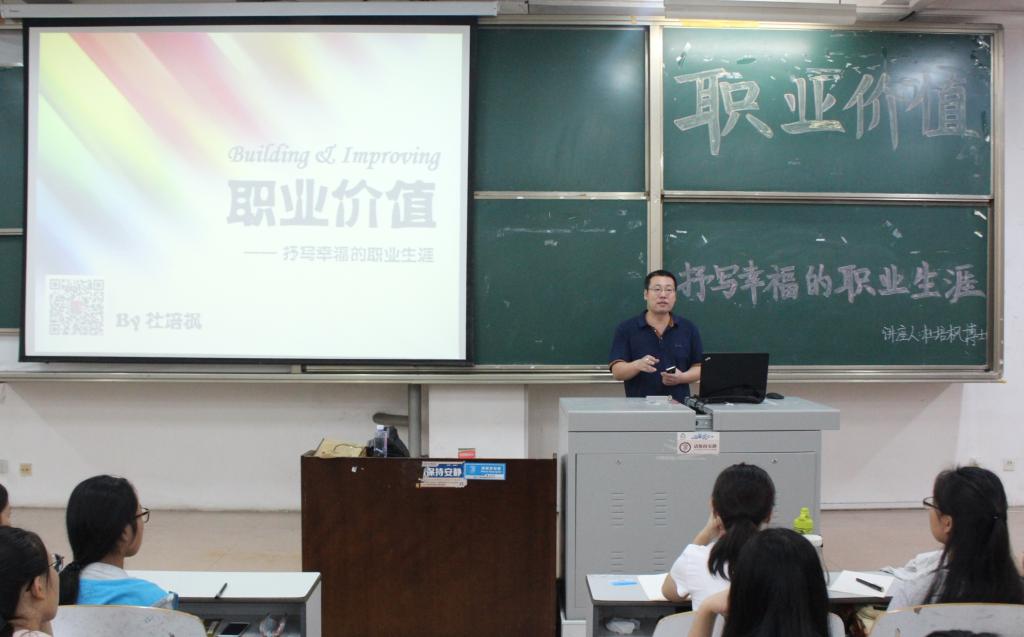 杜培枫博士借助思维导图剖析了自我竞争力与价值的重要性,指出应通过了解职场成功领导者与优秀员工的共同特性来增强职场新手的社会适应能力,强调求职应寻找符合自身性格的机构,深度剖析求职、在职、离职的职场通则,最后以讲解实例的方式,带领同学们来了解行业的具体特征。其中,杜培枫先生结合面试具体实例对如何求职获取就业信息并让简历脱颖而出进行了深度剖析,又通过做游戏测试的方式使同学们了解自己的性格特点。他风趣幽默的语言给同学们留下深刻的印象,一针见血的评价包含了许多宝贵经验。现场气氛很是融洽,不时引起在座同学的阵阵掌声。