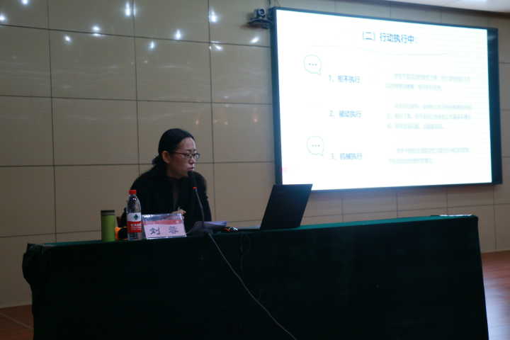 在培训中,刘蓉老师以“浅谈学生干部的执行力”为授课主题,从学生干部执行力的概念、学生干部执行力中存在的问题、学生干部执行力中存在问题的分析以及如何提升学生干部执行力这四个方面展开培训。刘蓉老师在培训过程中结合自己学生时期的工作经历要求学生干部培养工作的主动性和能动性,尽量避免工作过程中的拒不执行和被动执行。另外,刘蓉老师也指出了目前学生干部在工作过程中出现的机械执行、执行力不足以及办事畏难情绪严重、抗挫能力差等问题。其次,刘蓉老师鼓励全体学生干部能够以饱满的热情和积极的态度投身于学生工作中,不断提高自身工作能力和素质,全面发展自己。最后,此次培训在同学们的热烈掌声中走向了尾声。