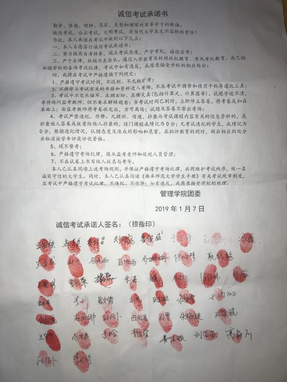 各班级负责人宣读《诚信考试承诺书》,全体同学本着对自己负责、对家庭负责、对学校负责、对社会负责的态度,认真学习其内容,签下名字并郑重捺下指印,表明自己将自觉遵守考试纪律的决心和坚决抵制考试作弊的承诺。