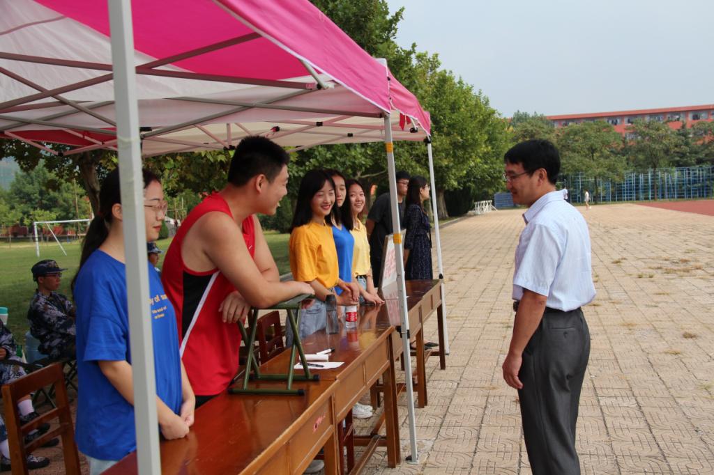 浏览量: 更新日期:2019-09-10按照学校相关要求,9月9日起,学院全体新生开始了为期14天的军训活动。学院党委副书记赵杰、16级辅导员李静琪、19级辅导员董世超来到军训场地询问19级新生军训情况。