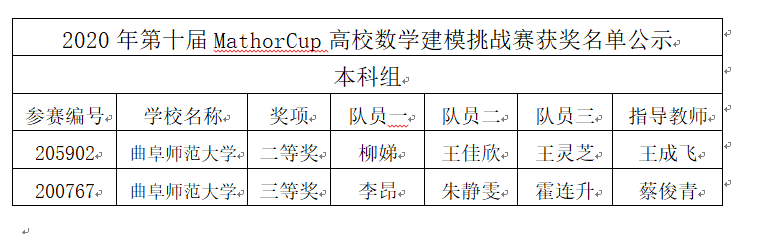 近日,第十届MathorCup高校数学建模挑战赛成绩揭晓,曲阜师范大学参赛队伍共获二等奖2项,三等奖4项,成功参赛奖3项。其中,风车动漫 共2只队伍参赛,分别荣获得二等奖1项、三等奖1项的优异成绩,获奖质量与获奖数量位居前列!