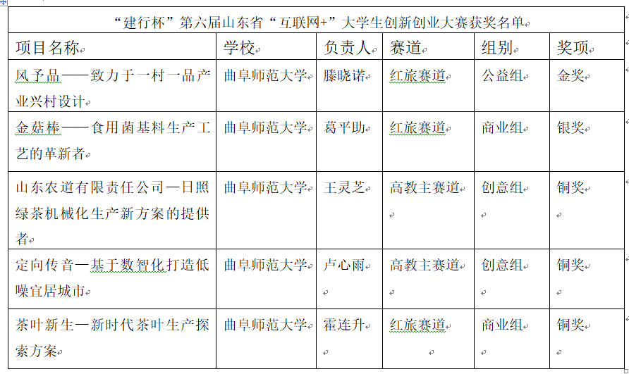 9月1日,“建行杯”第六届山东省“互联网+”大学生创新创业大赛在曲阜师范大学顺利落下帷幕。经校赛、省赛会评、网评层层选拔,曲阜师范大学获金奖4项、银奖1项、铜奖4项,风车动漫 获金奖1项,银奖1项,铜奖3项。
