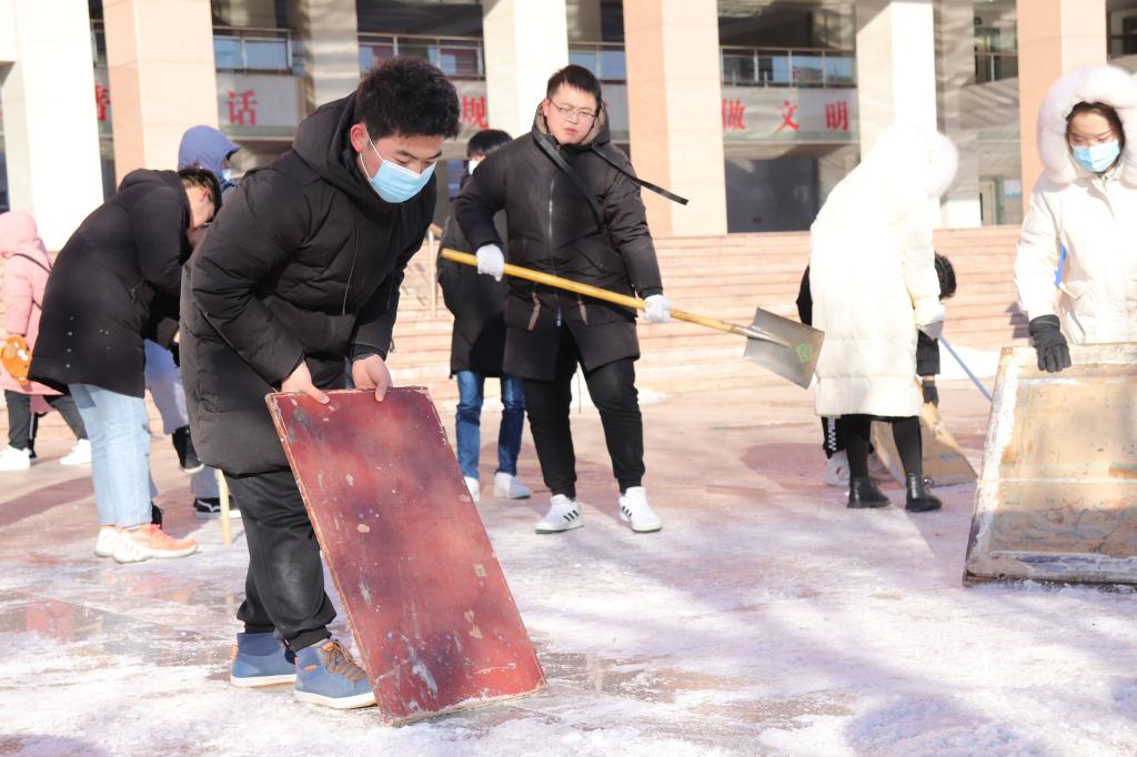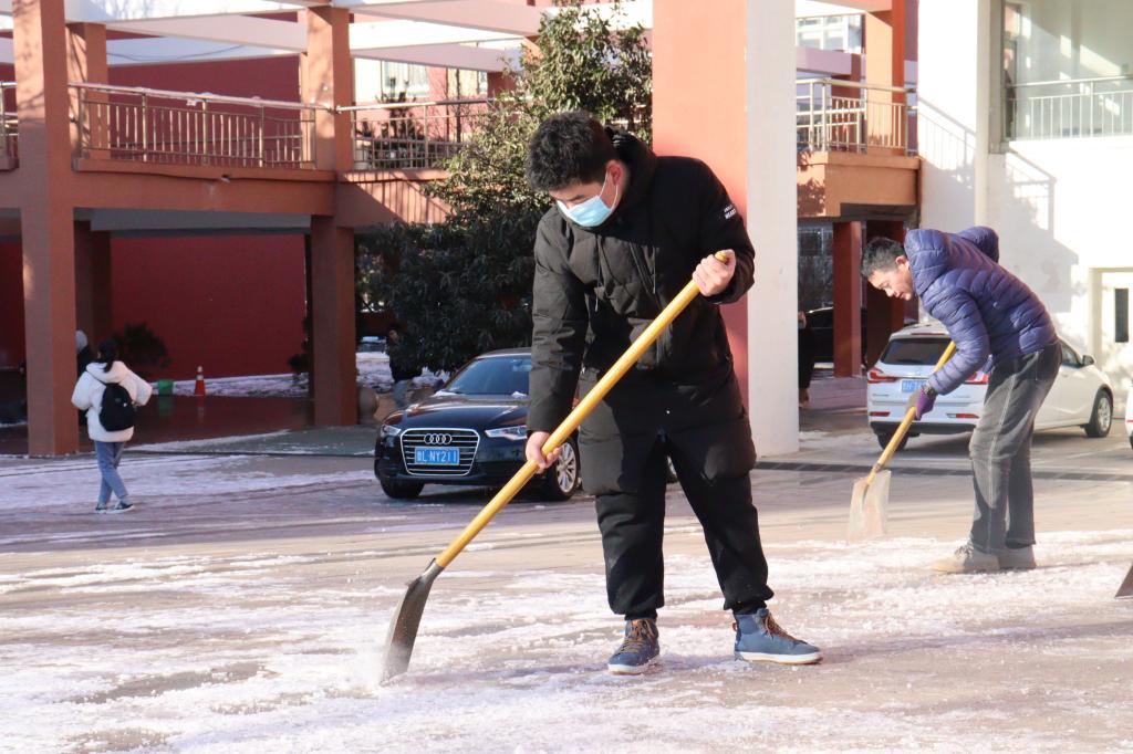 参与人员积极投入到活动中,大家拿着铁锹与扫帚来到分配好的场地,开始了清扫活动。雪积得比较厚,室外气温很低,志愿者们的手和脸冻得通红,但这并没有影响志愿者的热情和工作效率。劳动过程中,大家团结协作,干劲十足,发扬吃苦耐劳、顽强拼搏的精神,顶着寒风将分担区的积雪清扫干净,又投入到下一个清雪区,团结的力量让这个冬日变得格外灿烂和温暖。洁白的雪花映照着一张张因劳动而红彤彤的脸庞,扫雪队伍成了冬日校园一道靓丽风景线。