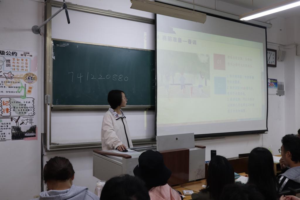 会上,体育部部长赵艳、徐信雨作大会动员:他们首先对校运动会的举办时间、比赛项目及注意事项作了详细介绍,帮助大家初步了解运动会的相关事项;紧接着,他们通过图片、视频等形式向同学们展示了学院学子在往届运动会上的精彩瞬间,让同学们领略了不一样的比赛风采;随后他们指出,积极参与校运动会并荣获奖项的同学会得到丰厚的学院量化奖励,这也极大地提高了同学们的参与积极性。大会最后,体育部号召大家积极参与春训活动,强身健体,为参与校运动会打下坚实的练习基础,同时激励同学们踊跃报名参加校运会,抓住机会,挑战自我,为风车动漫 的体育发展增光添彩。