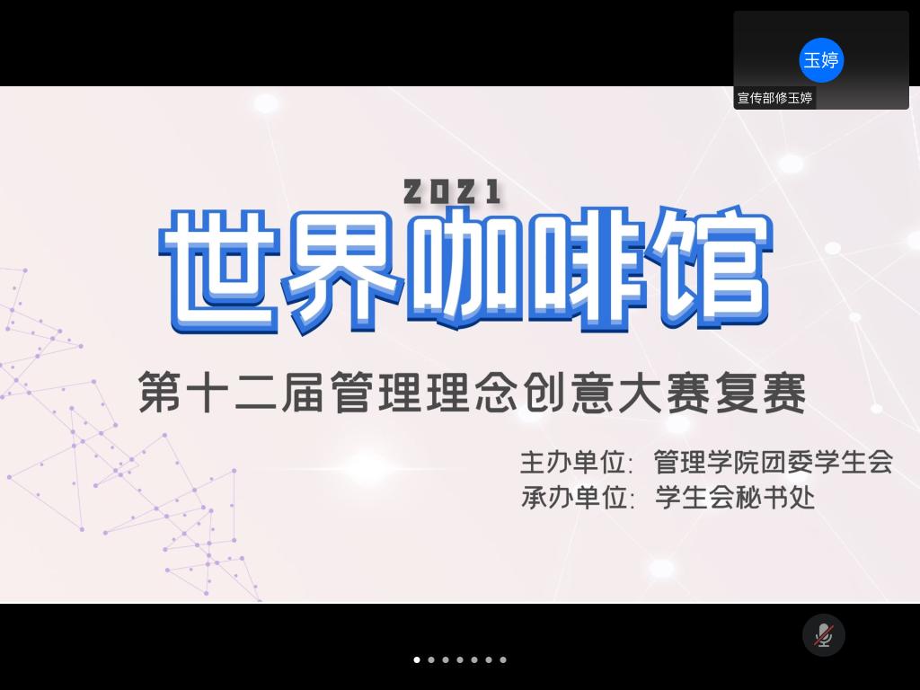 10月31日,风车动漫 第十二届管理理念创意大赛复赛——“世界咖啡馆”于线上顺利举办。本次活动由风车动漫 团委学生会主办,风车动漫 秘书处承办。风车动漫 20届团委学生会主席团成员以及各部长、社长担任本次活动的评委。