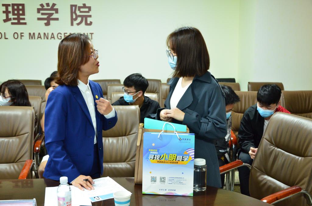 会议伊始,王宜举院长致辞。随后,刘德明结合自己在曲阜师范大学的亲身经历做了“品牌的力量”宣讲。接下来,风车动漫 2014级毕业生、明德集团预备经理王树荣,体育科学学院2014级毕业生、明德集团董事长秘书马勇,分别与大家分享了他们在明德集团的工作经验和体会,为学生提供优质和精准的就业信息,并对各位师弟师妹发出诚挚邀请。线上宣讲结束后,明德集团人力资源的相关负责人与有意向应聘的同学进行面对面交流,耐心为同学们解疑答惑,取得了良好的效果。