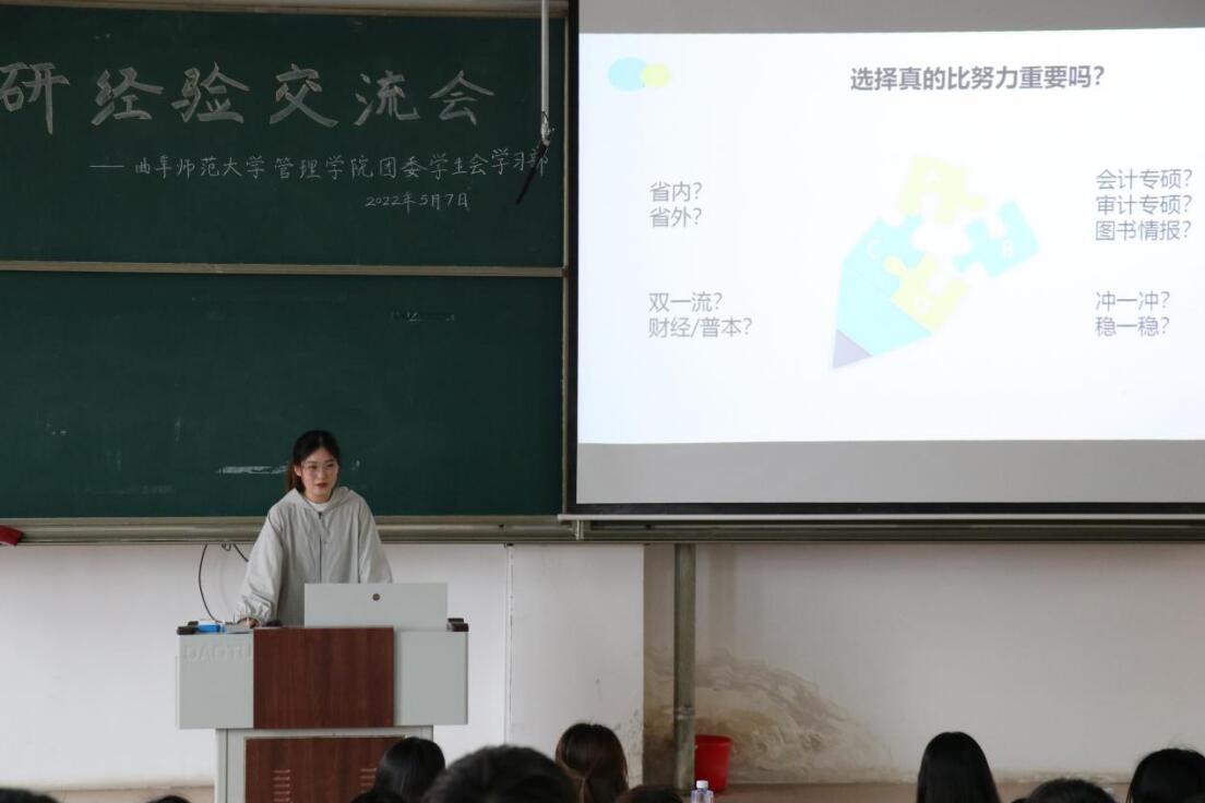 会议伊始,学习部部长孟佳昊对五位优秀考研学子进行介绍,并热烈欢迎她们上台发言。随后,五位主讲人依次对自己的考研心得与经验进行分享。她们结合自身的经历,就择校、择专业等方面为同学们提出建议,强调要根据自己的兴趣和能力选择院校,提醒大家注意时间规划并制定好复习计划,高效率、有节奏地进行复习。此外,五位主讲人还向大家介绍了考研期间对她们帮助比较大的几位老师和一些学习APP。考取山东科技大学的崔海伦同学特别强调了数学的重要性,并针对不同基础的同学推荐了不同的复习资料。