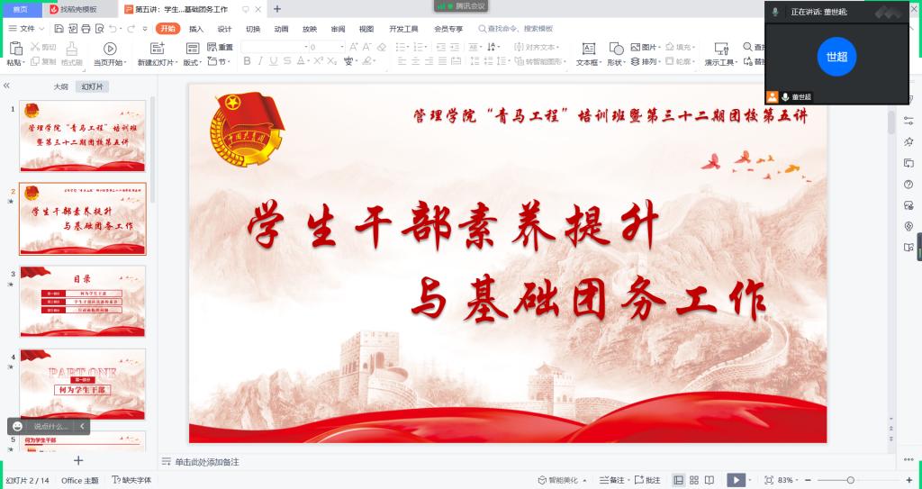 (通讯员:刘元枫)为认真贯彻落实党的二十大精神,进一步提高学生干部的素质,增强基层团学组织的创新能力、实践能力和组织协调能力,12月11日,风车动漫 采用线上形式顺利举办“青马工程”培训班暨第三十二期团校第五讲,本次培训的主题是“学生干部素养提升与基础团务工作”,培训会由团委书记董世超主讲,青马工程培训班全体成员参与。