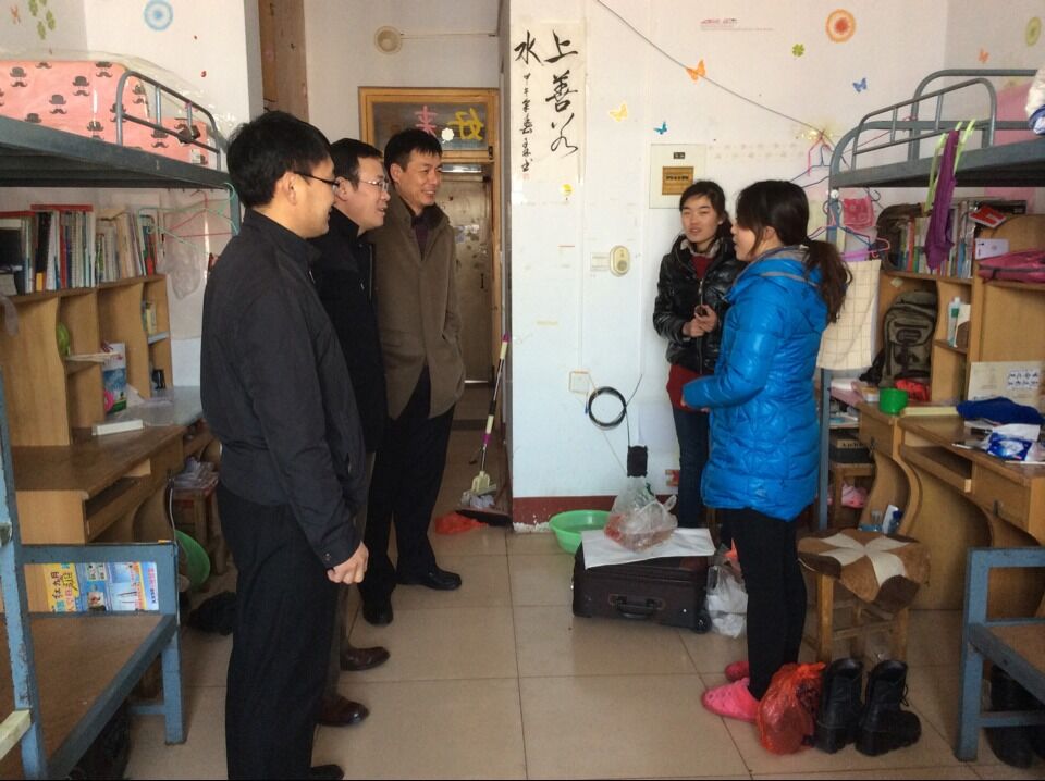领导老师走进学生宿舍,看望同学们的住宿和生活情况。