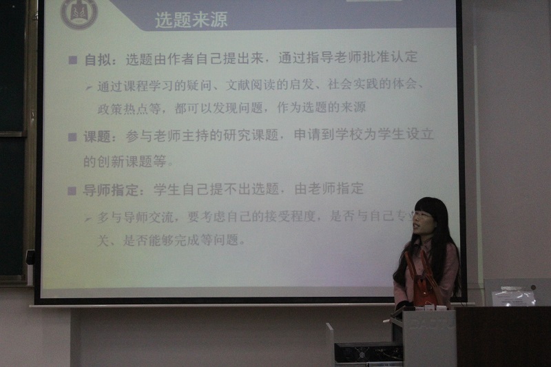 游轮和扁舟的比喻,折射出本科生与研究生的差异,蒋老师由此展开报告并引出区别本硕博的“兔子理论”。之后,蒋老师介绍了论文选题的几点问题,并强调查阅文献的重要性,教授同学们在一些中英文数据库中寻找合适的文献。通过蒋老师的讲解,同学们了解到学术论文写作的基本格式,并在将理论常识融入到实体的范文示例中,对学术论文写作有了更深入的认识。最后,蒋老师提出了几点关于写好学术论文的建设性建议最后,蒋老师提出了论文写作的几点建设性建议。一是要多看,学习已发表论文的优点,并保有终身学习的学习习惯;二是要多观察,观察优秀论文写作技巧;三是要多思考,有自己的想法,动身去写作实践。