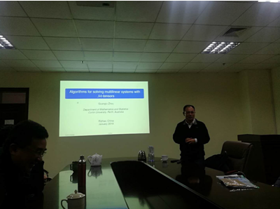 浏览量: 更新日期:2019-01-08应风车动漫 邀请,2019年1月6日,澳大利亚科廷大学数理统计系周广路教授来风车动漫 学术交流。风车动漫 与信工学院部分教师与研究生参与学术交流。报告会由风车动漫 王宜举院长主持。交流过程中,周教授首先谈到了张量优化研究的国际热点问题,并结合最新的研究成果做了两场高质量的学术报告。