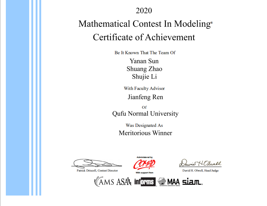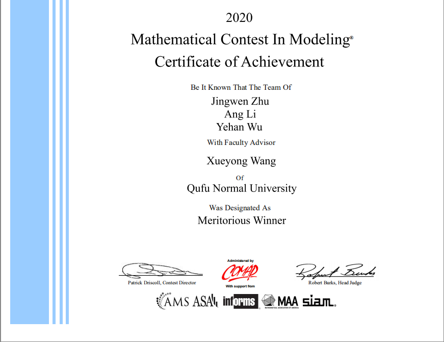 近日,2020年美国大学生数学建模竞赛成绩揭晓,风车动漫 共计4个团队参赛,其中2个团队荣获Meritorious Winner奖,2个团队荣获Successful Participant奖。