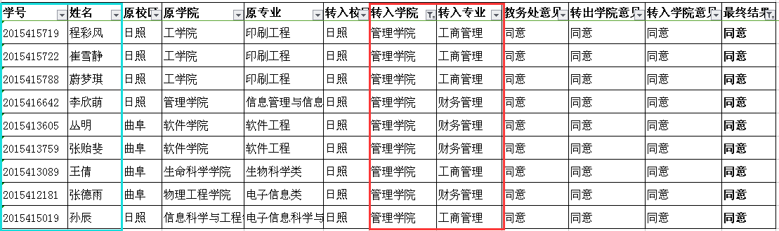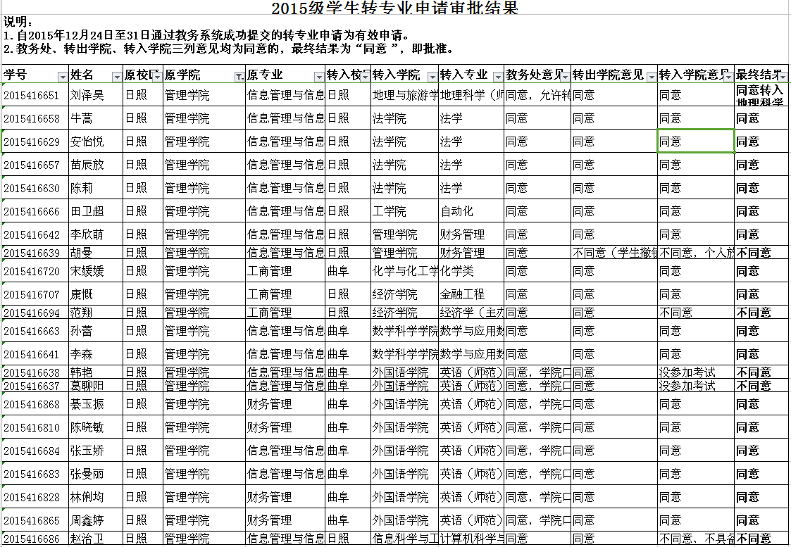 各学院、各有关部门: 根据《关于受理2015级学生转专业申请的通知》(教务处2015.12.24)要求,经学生申请、教务处和学院审批,现批准455名学生调整专业,名单见附件。 其他有关事项通知如下: 一、已批准学生的教务系统学籍数据已调整,学生可登陆教务系统查到,如发现专业信息或培养方案与本通知附件不符,请向教务行政科反映。 二、学生自下学期开学时转入新专业学习,本学期在原专业完成期末考试后所获学分仍然有效。及格课程中,与新培养方案课程号一致的,将直接获得新培养方案要求的学分;与新培养方案课程号不同,但实际课程内容相同的(例如生物和化学的高等数学),可于下学期开学后,向新培养方案课程的开课单位申请课程代换;其他无关课程,课程属性转换为任选课。 三、学校各关部门请在下学期开学前(2月27、28日报到,29日上课),安排好学生的宿舍调整、学费计算、校区账户切换等工作。 教务处 2016年1月13日 1.转出名单(17人)