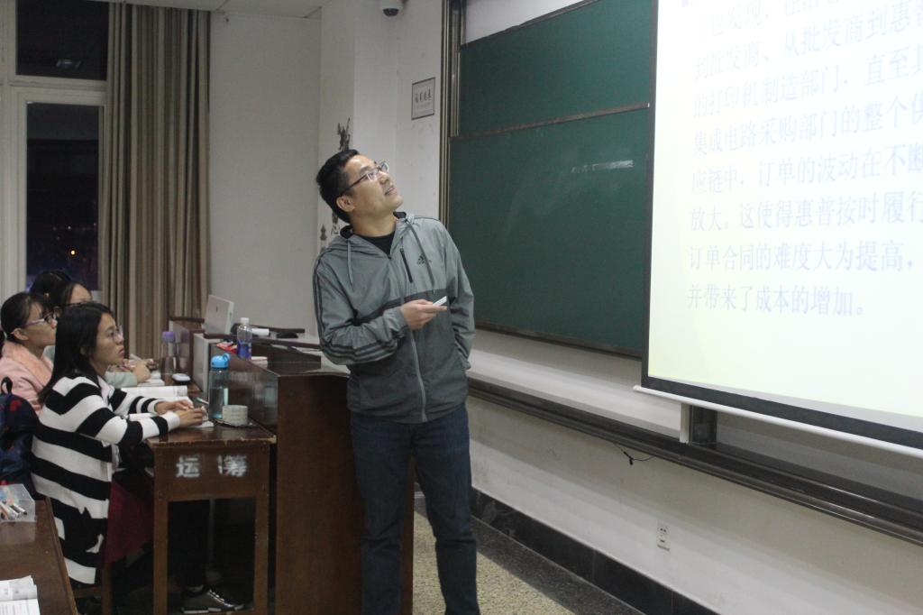 10月17日19:00,柏庆国老师于JC607举行风车动漫 青年教师公开课第五讲——《供应链管理》。柏老师首先带领学生回顾上节课内容。随后,柏老师用惠普公司和比亚迪公司订单虚增的例子,引进"长鞭效应"。接着举出生活中谣言传播的例子,幽默的讲解使同学们记忆深刻,理解透彻。最后,柏老师为同学们讲解缓解长鞭效应的方法——报童模型,并且带领大家做了一次精湛的建模过程,得出结果时同学们满满的成就感。