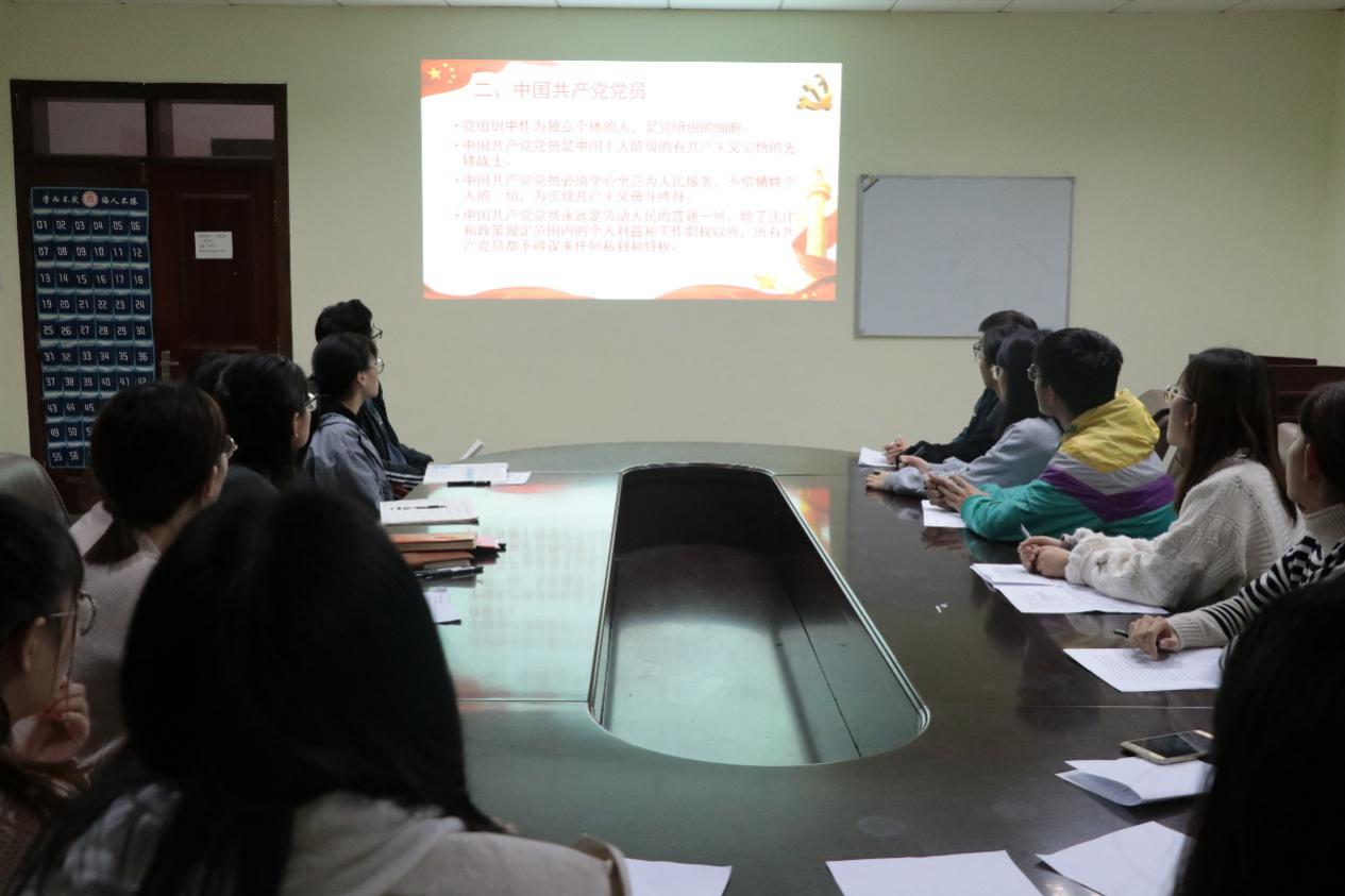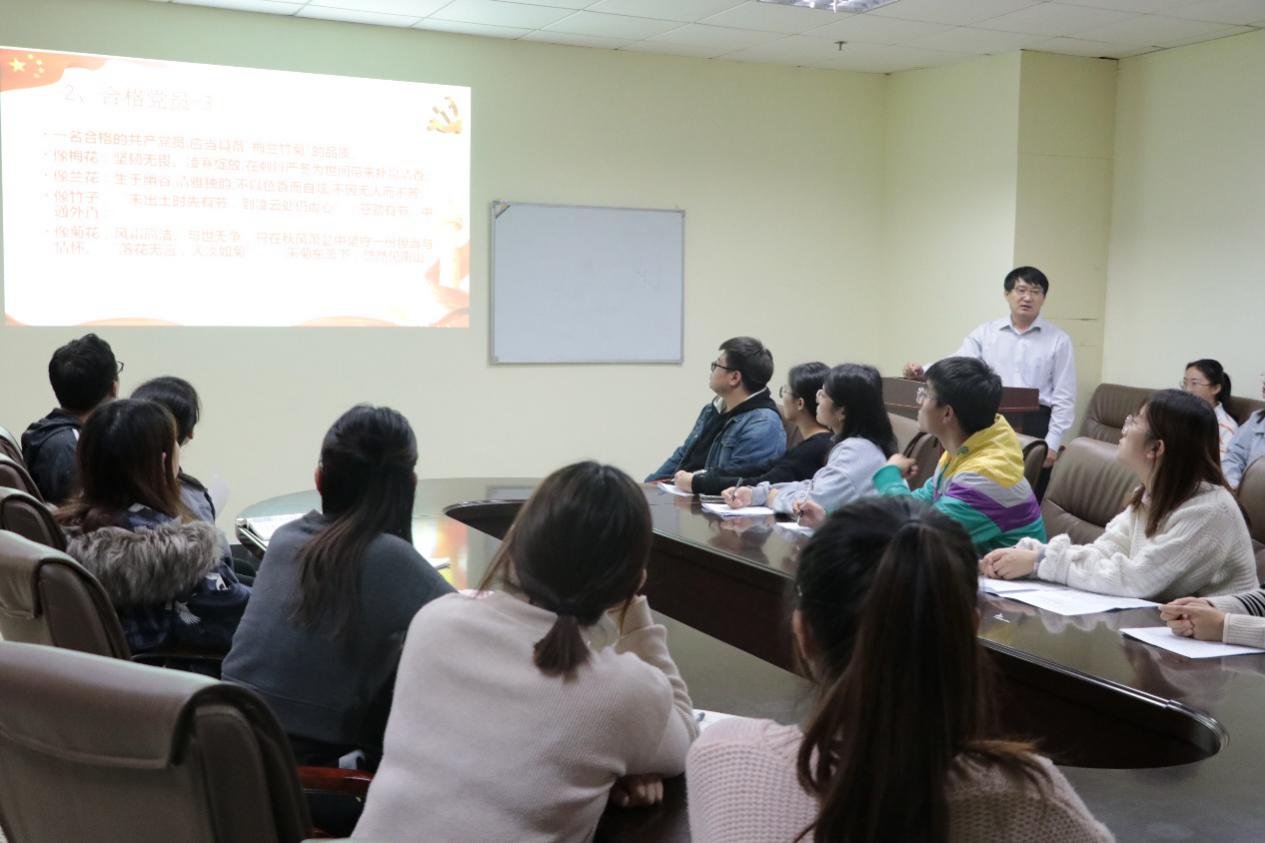 活动伊始,赵杰同志以“伟大正确光荣的党——中国共产党”为切入点,带领本科生党员从中国共产党的性质和地位、指导思想和基本路线以及任务等方面全面学习中国共产党的前进路线、指导方针。随后赵杰讲到,一名合格的共产党员,应具备“梅兰竹菊”的品质,并恰当行使权利、积极履行义务、承担党员责任。同时,赵杰结合学院实际发展,给全体本科生党员提出以下具体要求:理想信念坚定,对党绝对忠诚;自觉遵守党章,严格遵守党规党纪,遵守国家法律法规;宗旨观念强,坚持立德树人;热爱和熟悉党务工作;讲政治、顾大局,敢担当。党课最后,赵杰结合中共优秀党员的事例激励本科生党员在未来的生活中不忘初心,砥砺前行,以实际行动助力学院发展。